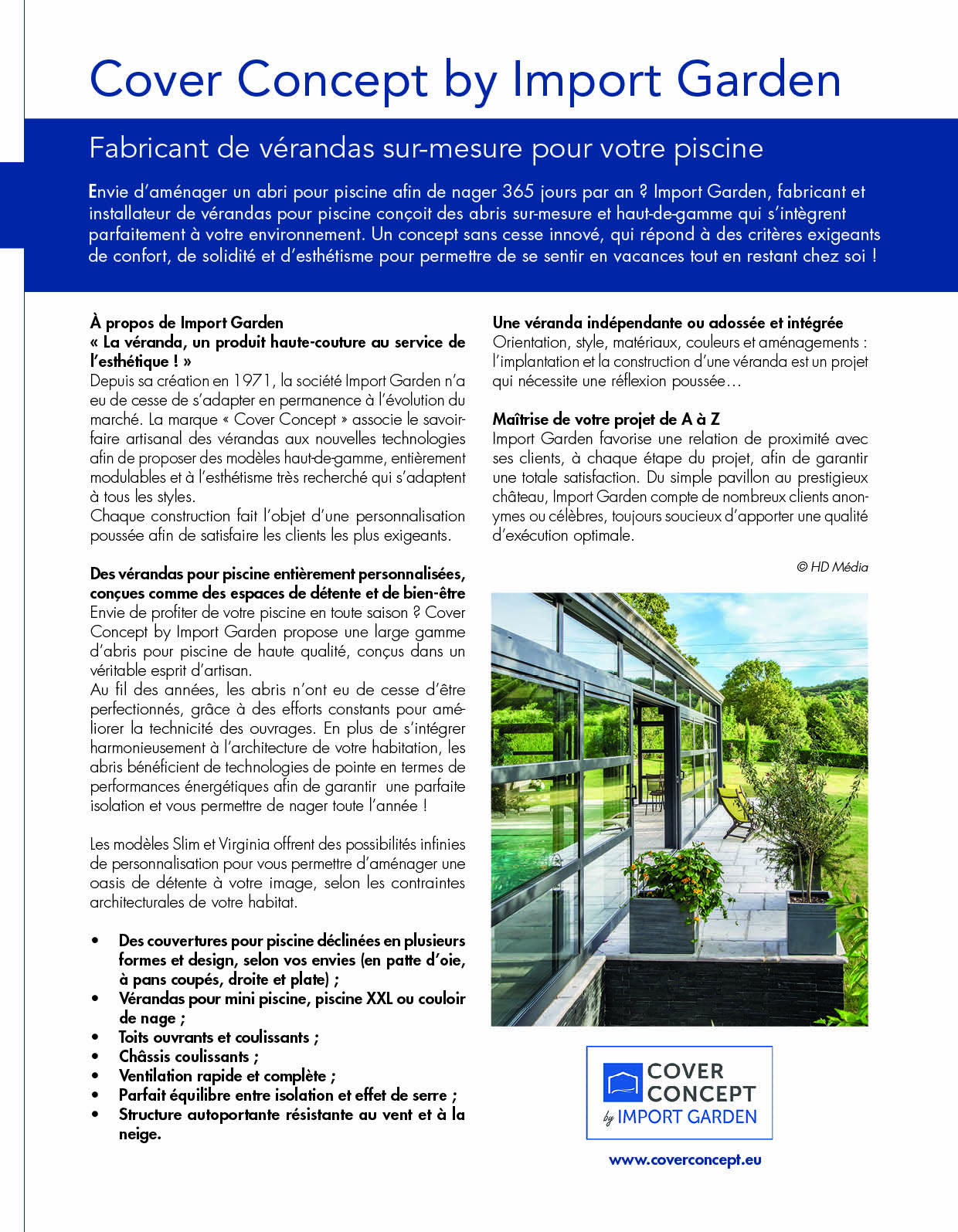 Nos abris hauts pour piscine dans le MAGAZINE Maison et Jardin (N°60 – 2021)Démarrons l’année sur les chapeaux de roues ! Les abris hauts pour piscine de Cover Concept sont présents dans le nouveau numéro de « Maison et Jardin ». Ce magazine est LA référence en matière de décoration et d’aménagement. Apprenez-en davantage sur les différents modèles proposés et apportez une touche d’élégance à votre extérieur. La véranda : entre esthétisme haut de gamme et confort absoluVous rêvez d’installer une piscine dans votre jardin et d’en profiter à chaque instant ? Un abri haut vous assure une baignade en toute sérénité, et ce, tout au long de l’année.Cover Concept répond à vos envies et aux contraintes architecturales les plus rigoureuses, à travers une approche sur-mesure. Orientation, style, implantation… Chaque projet de couverture piscine est pensé de manière unique. Le modèle Slim se mêle intelligemment au paysage environnant et séduit ses propriétaires grâce à la pureté de ses lignes. La véranda Virginia, quant à elle, offre de nombreuses possibilités de personnalisation. Quel que soit votre choix, vous avez la garantie d’obtenir un espace entièrement conçu à votre image. Toitures disponibles sous plusieurs formes et designVentilation optimaleOuvrants et coulissants avec possibilité de motorisation Structure autoportante Nous prenons le temps de vous aiguiller à chaque étape de votre projet. Demandez votre devis via notre formulaire en ligne.