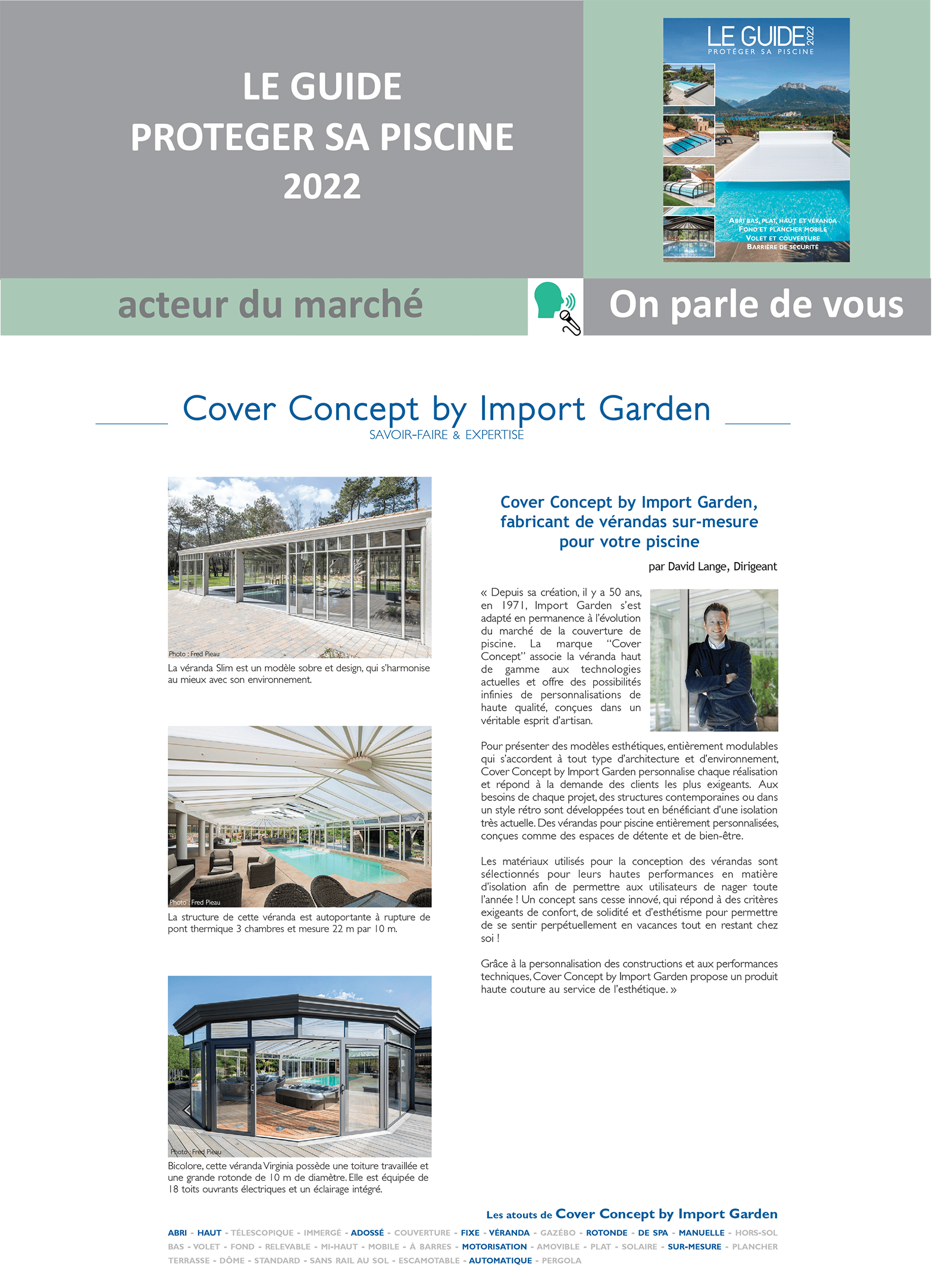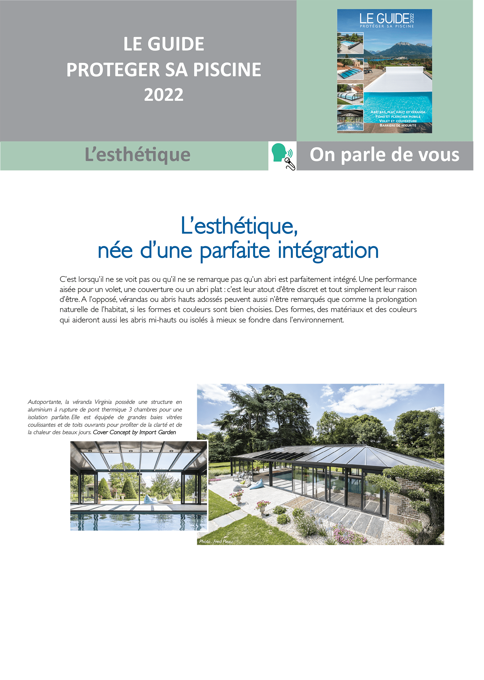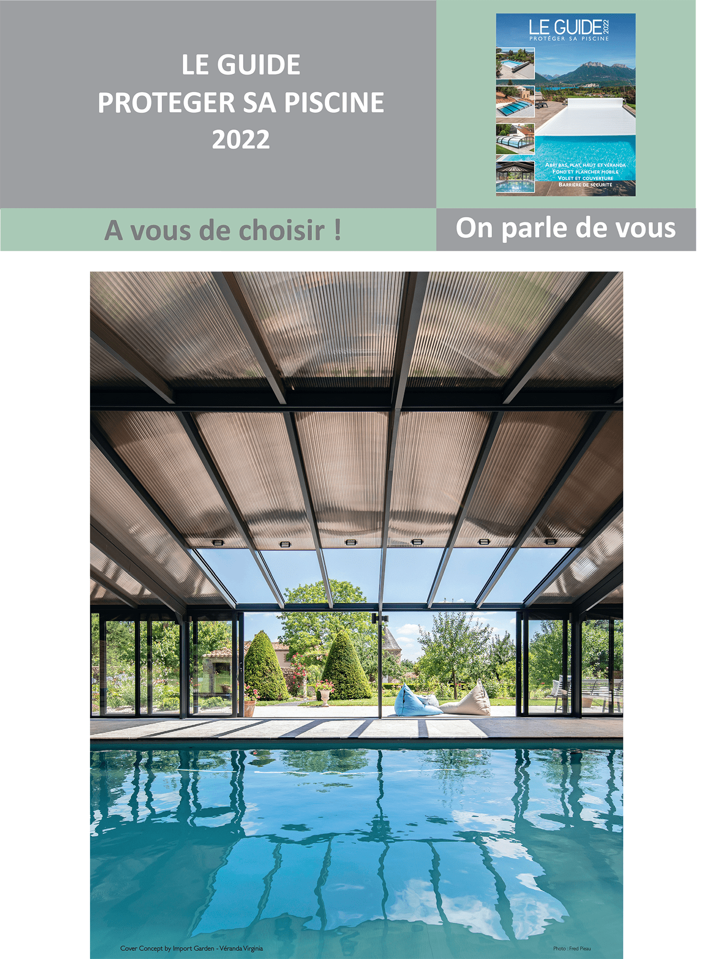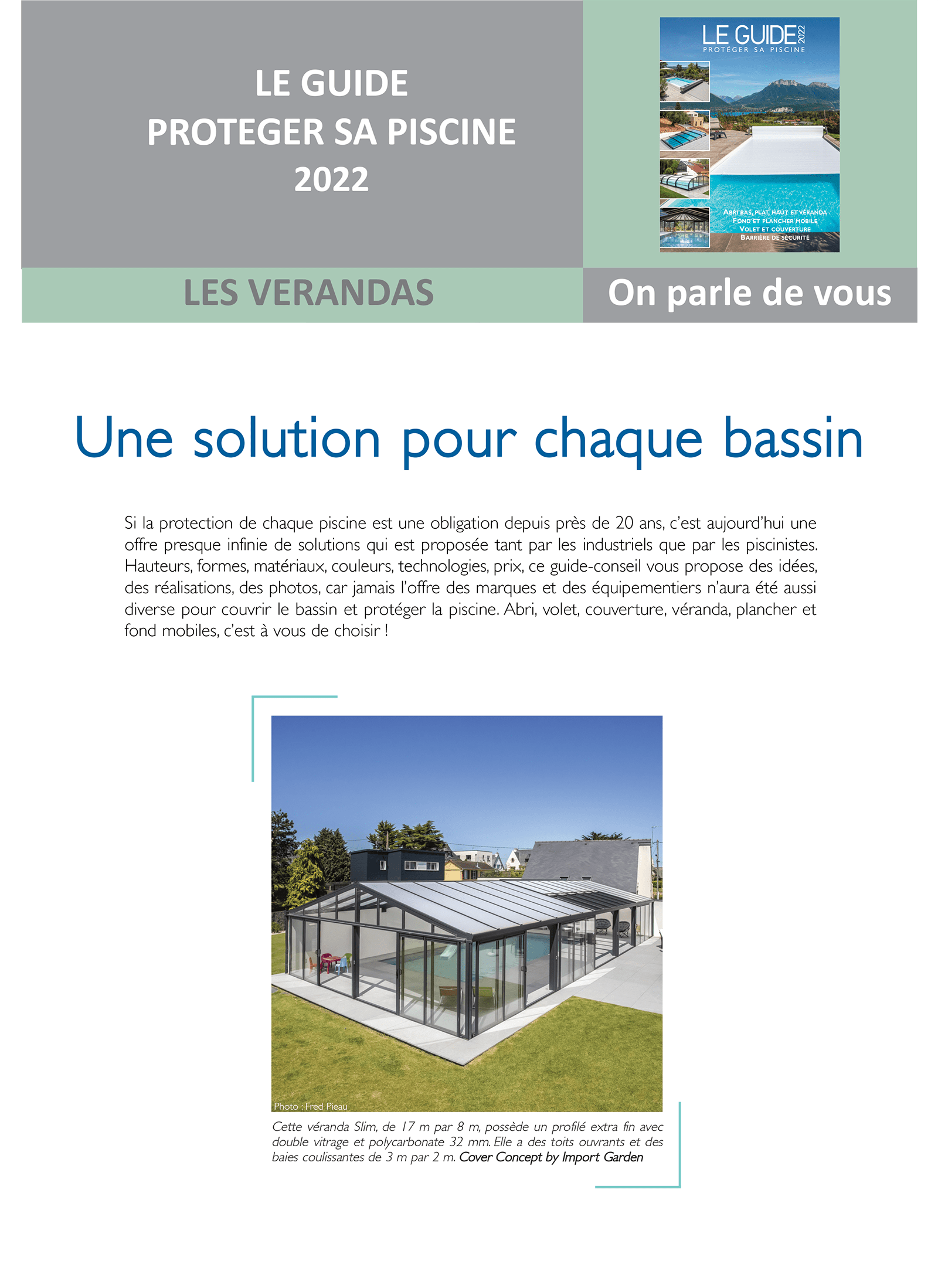 NOS REALISATIONS DANS LE MAGAZINE Le Guide – Protéger sa piscine (2022)Vous désirez couvrir votre bassin privé pour le protéger des aléas extérieurs ? Volets, planchers mobiles, abris bas ou mi-hauts, vérandas… De multiples solutions existent sur le marché ! Cover Concept est spécialisé dans la fabrication d’abris hauts sur-mesure. Découvrez nos réalisations dans le nouveau numéro du Guide – Protéger sa piscine (2022) et les avantages d’une véranda haut de gamme. Une question de fonctionnalitéContrairement à d’autres solutions de protection, la véranda pour piscine offre de nombreuses possibilités d’aménagement. Imaginez-la comme une véritable pièce de vie supplémentaire ! Vous pourrez siroter votre boisson préférée au bord de l’eau ou encore inviter vos ami(e)s afin d’échanger autour d’une passion commune, et ce, dans une atmosphère relaxante et agréable. Par ailleurs, les baies vitrées laissent filtrer la lumière du soleil et rendent votre nid lumineux.En prime, l’abri de piscine haut vous permet de vous baigner à tout moment de l’année, en faisant abstraction de la météo. Idéal pour les amoureux de natation ! D’autant plus que la pollution extérieure n’aura pas raison de votre bassin… La véranda au service de l’esthétismeEn dehors de ses avantages technologiques, la véranda pour piscine est un atout de charme pour votre propriété. Elle se dessine au gré de vos envies selon la hauteur, la forme, les matériaux et les couleurs désirés. La structure s’inscrit dans le prolongement de votre habitation et s’adapte au paysage environnant. Chaque projet est pensé selon vos besoins et les contraintes urbanistiques.