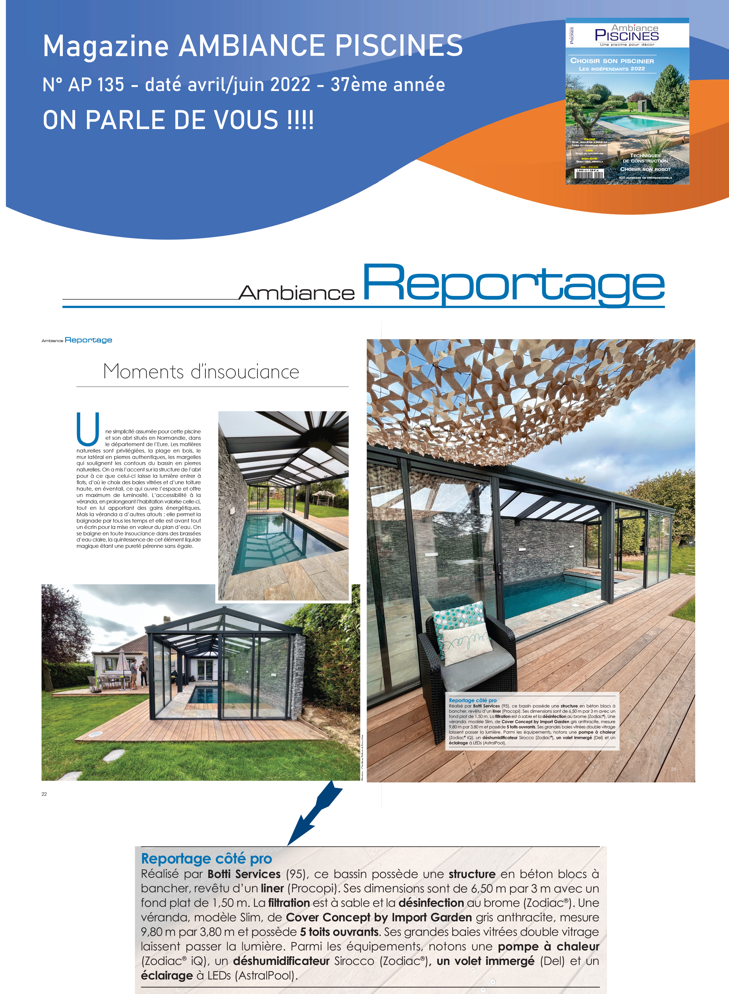 NOS REALISATIONS DANS LE MAGAZINE AMBIANCE PISCINES (N°135 – AVRIL / JUIN 2022)Le choix des prestataires concernant la construction de votre bassin privé et de votre abri haut n’est pas à prendre à la légère… L’édition numéro 135 du magazine Ambiance Piscines met à l’honneur diverses réalisations, dont celle de Cover Concept by Import Garden, votre fabricant de vérandas pour piscines. Abri de piscine haut : un atout charme naturelL’équipe de Cover Concept by Import Garden s’est rendue dans le département de l’Eure en Normandie, où elle a concrétisé un nouveau projet d’aménagement haut de gamme. La structure a été pensée pour apporter un maximum de luminosité à l’intérieur de la véranda. Ses larges baies vitrées et la toiture haute en forme d’éventail accentuent le sentiment de grandeur ressenti, tout en offrant une vue imprenable sur le jardin verdoyant. Mêlant esthétisme et praticité, cet abri est accessible directement par l’habitation et permet à ses occupants de nager 365 jours par an.Une véritable pièce de vie supplémentaire qui se démarque grâce à son mur latéral en pierres naturelles et à sa plage de piscine en bois ! Vous aussi, apportez une plus-value supplémentaire à votre propriété en construisant votre véranda pour piscine. Actif depuis 1971, Cover Concept by Import Garden réalise votre projet sur-mesure.