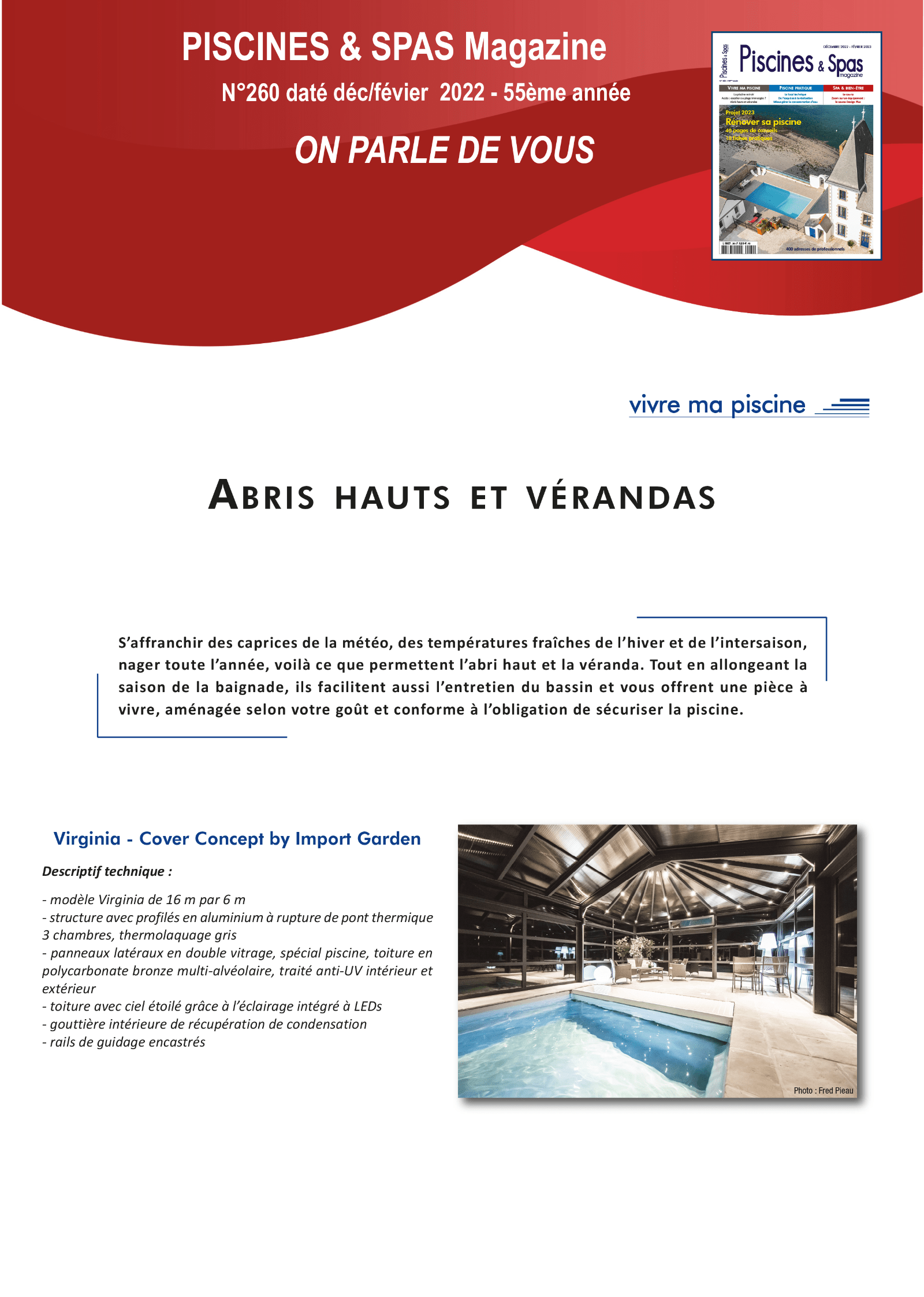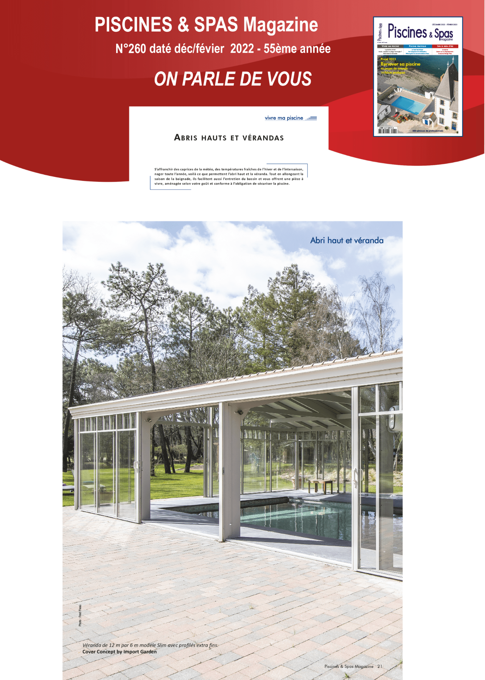 NOS REALISATIONS DANS LE MAGAZINE PISCINES & SPAS (N°260)Cet temps hivernal favorise le cocooning ! Besoin d’allonger la saison des baignades grâce à une piscine élégamment couverte ? Affranchissez-vous des caprices de la météo grâce aux vérandas Cover Concept. Nos réalisations s’invitent au cœur de la dernière édition du magazine Piscines & Spas, un concentré d’informations utiles pour concrétiser votre projet de piscine privée. Pourquoi opter pour une véranda ? Des matériaux nobles, un modèle sur mesure, un véritable espace de vie supplémentaire… La véranda pour piscine séduit les amoureux de natation et d’architecture haut de gamme. Parfaitement intégrée à l’habitation ou trônant fièrement au sein de votre jardin, elle répond aux attentes les plus pointues ! Son isolation performante, son toit ouvrant sur l’extérieur et sa modularité en termes d’aménagement en font un précieux allié pour toutes celles et ceux qui sont à la recherche d’un haut confort au quotidien.