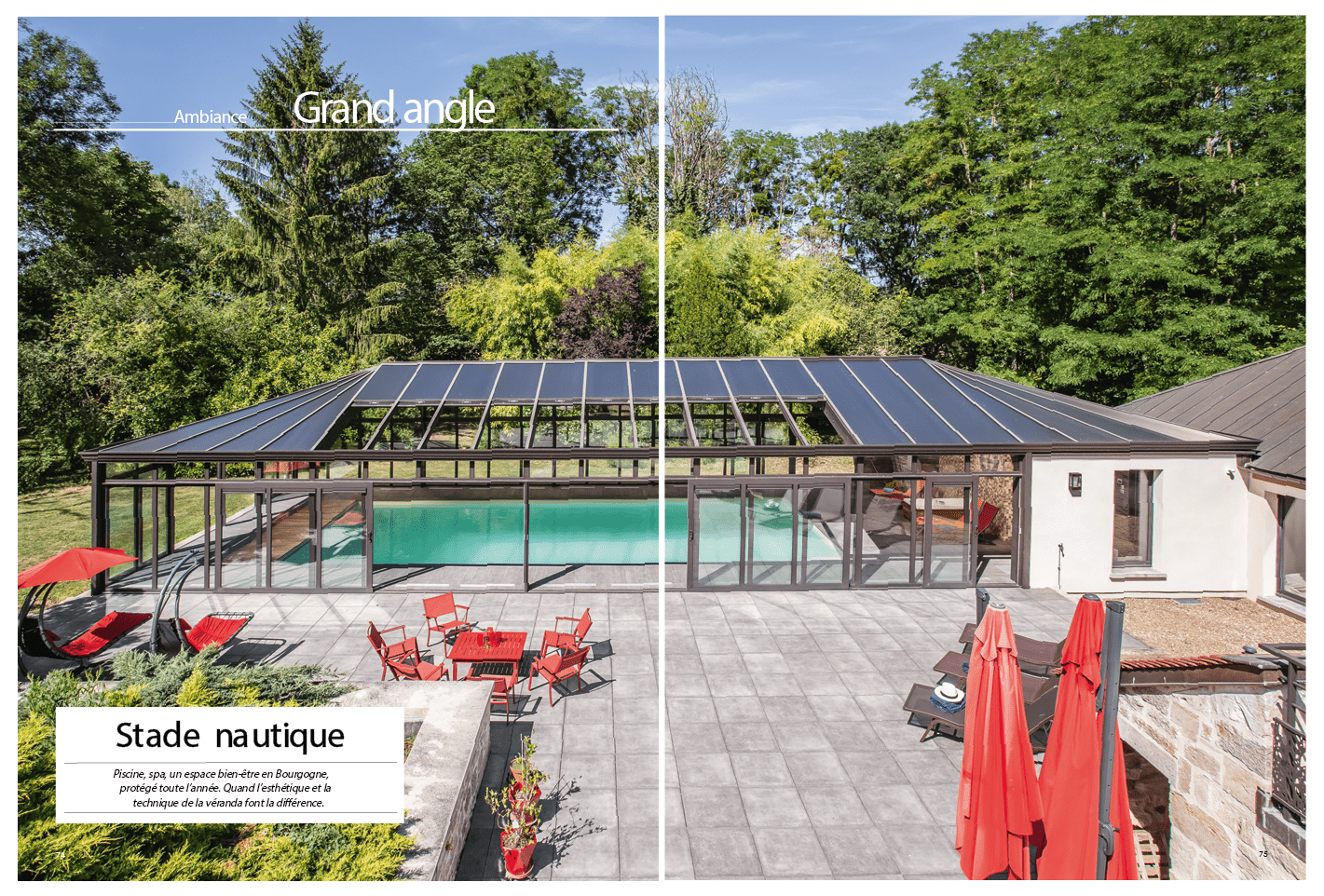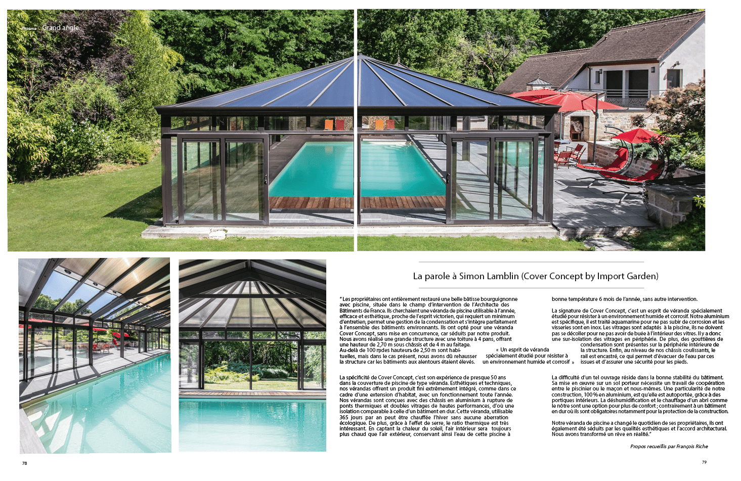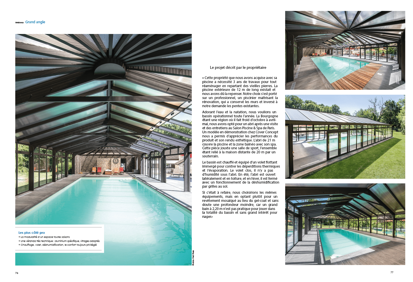 Nouveau reportage de Cover Concept dans l’Ambiance Piscines (N°129 – Octobre 2020)L’édition 129 de l’Ambiance Piscines laisse la parole à notre commercial Simon Lamblin et au propriétaire d’un magnifique projet en Bourgogne. A travers ces quelques lignes, suivez la concrétisation d’un rêve aux reflets azurés. L‘esprit « Cover Concept », c’est un mélange subtil d’esthétisme, d’expérience et de praticité ! Véritable stade nautique, la véranda mise à l’honneur adopte un style victorien et couvre à la fois un bassin, un spa et une zone balnéo. Cette réalisation, parfaitement intégrée au paysage, mêle trois caractéristiques fondamentales : une modularité exemplaire, des technologies de pointe et une série d’équipements accentuant le confort ressenti par ses occupants. Utilisation d’un aluminium spécifique, solution de déshumidification, vitrages adaptés… Le projet a été étudié pour cohabiter avec un environnement à la fois humide et agressif. CARACTÉRISTIQUES DU MODÈLE :Toiture à 4 pans en polycarbonate bronzeAbri de 21 mètresDéshumidification par grilles au sol Envie d’un abri haut véranda pratique en toute saison ? Demandez-nous une étude de votre projet.Note : pour une meilleure visibilité, n’hésitez pas à cliquer sur chaque image et à utiliser la fonctionnalité « loupe » (en haut à droite) mise à votre disposition ! Demandez votre devis