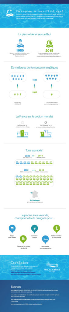 La véranda pour piscine en FranceEn France, des piscines publiques vieillissantes, des piscines privées florissantesPlus de 60 % des piscines de natation de l’Hexagone ont plus de 25 ans et ont besoin de rénovations. En outre, elles ne répondent plus nécessairement au mode de vie des Français.En effet, pour beaucoup, la piscine n’est plus seulement un lieu de sport. Le public recherche aujourd’hui des installations plus ludiques et orientées « famille ».Essor de la piscine privéeLa piscine privée répond à cette évolution : des piscines plus petites et moins profondes, mais équipées de plus de confort (abris, escaliers, espace balnéo, ouvrants de toiture motorisés…).Les piscines sont également plus performantes et écologiques que par le passé : entre 1980 et 2015,– le volume d’eau pour le remplissage de la piscine a été divisé par 3 ;– la consommation d’énergie pour le chauffage a été divisée par 9.Pour toutes ces raisons, les Français sont les n°1 de la piscine privée en Europe, les n°2 au niveau mondial, derrière les États-Unis.L’abri pour piscine : une croissance logiqueEn quinze ans, le parc des piscines a été multiplié par 2,5 dans tout l’Hexagone : en 2000, on comptait 708 000 piscines, pour 1,8 millions en 2015 (1,1 million de bassins enterrés et 733 200 hors-sol) ! L’année dernière, les ventes ont augmenté de 7,5% : les Français sont devenus les heureux propriétaires de 68 800 piscines sur cette seule période !Parallèlement à la recherche de confort et d’économie d’énergie, les abris pour piscine enregistrent eux aussi une belle croissance :– 8 300 abris pour piscine en 2003, contre 180 000 en 2015 ;– en Bretagne, 20 % des piscines sont sous abri.Ces couvertures pour piscine permettent en effet « d’allonger la saison des baignades, de faciliter l’entretien des bassins et de répondre à l’obligation d’installer un système de sécurité, s’ils sont aux normes », souligne la FPP*. Pour votre abri de piscine, choisissez un maximum de confort avec les vérandas pour piscine Cover concept by Import Garden et faites de votre coin bleu un espace de vie pour toute la famille ! Découvrez-les vite dans notre catalogue.* FPP : Fédération des professionnels de la piscine Contactez-nous pour une étude gratuite de vos projets Nous vous conseillons en fonction de vos besoins.