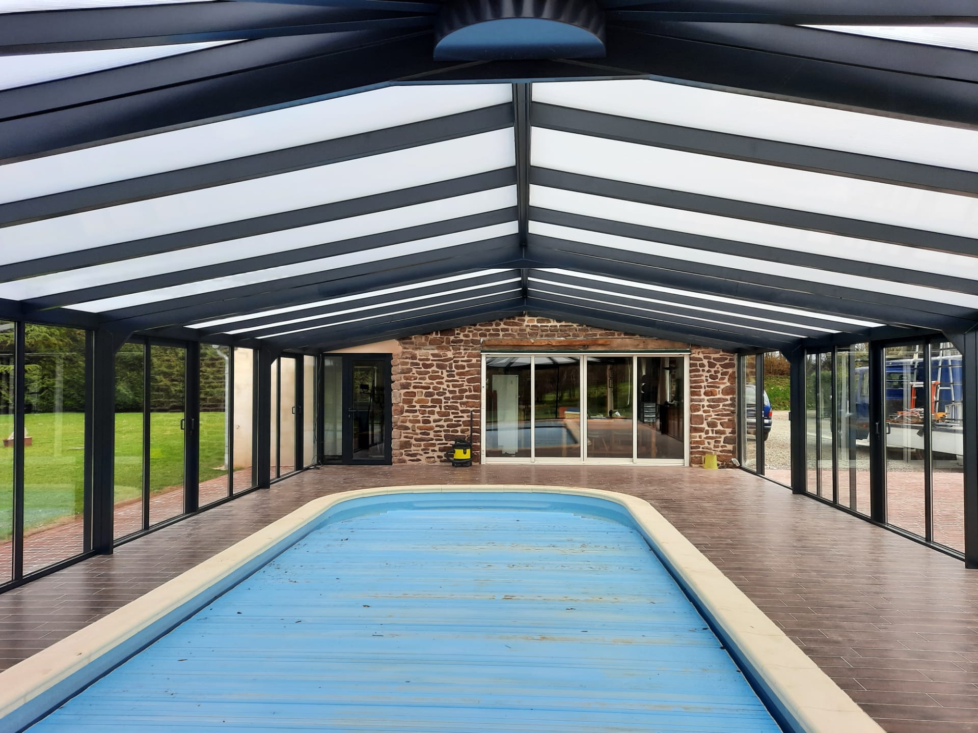 Réalisation d’un abri de piscine haut à HudimesnilL’équipe de Cover Concept by Import Garden s’est rendue dans le département de la Manche afin de réaliser une véranda pour piscine sur-mesure. L’objectif ? Apporter un vent de fraîcheur au quotidien de Claude et son épouse grâce à un espace de baignade marqué par la solidité de sa structure et à son charme naturel.Après chaque tempête, vient le calme.Il y a une dizaine d’années, Claude a voulu se faire plaisir en réalisant une piscine couverte par un abri haut. A cette époque, il sélectionne 3 entreprises, dont Import Garden, pour une étude de faisabilité. Son choix se porte alors sur une solution globalisée, mêlant les compétences groupées d’un pisciniste et d’un vérandaliste.Cet investissement lui permet de profiter d’un bassin privé avec la plus grande liberté et de profiter d’un confort exceptionnel. Les années passent… Malheureusement, le rêve tombe à l’eau en 2020 lorsqu’une tempête soulève la structure et rend la piscine inutilisable pour une question de sécurité. Cependant, la garantie décennale du constructeur peut encore intervenir et Claude espère ainsi pouvoir remplacer l’abri devenu hors-service.Une nouvelle étude de marché commence en mars 2020 et Import Garden est à nouveau sollicité concernant la réalisation d’une offre. Après quelques rendez-vous basés sur l’écoute et l’échange, Claude décide de faire confiance à notre savoir-faire de 50 ans et à la solidité de nos réalisations, renforcées par des fermes.Les mois filent, les assureurs s’accordent et une date est enfin définie pour le remplacement et la pose du nouvel abri haut pour piscine : février 2021.Un petit coin de paradis accessible depuis la maisonLe chantier s’est parfaitement déroulé et Claude nous a fait part de sa très grande satisfaction, tant au niveau de l’étude du projet, du suivi, du mesurage et de la pose. Aujourd’hui, il peut profiter en toute quiétude d’une bulle de confort directement annexée à son domicile et résistante aux épreuves du temps et de la météo. Le design épuré de la véranda s’intègre parfaitement au paysage environnant et offre un aspect naturellement haut de gamme.Nous sommes heureux d’avoir répondu aux attentes de Claude et lui souhaitons beaucoup de bonheur avec sa véranda pour piscine Cover Concept !Caractéristiques techniques de la véranda pour piscine :– Véranda Slim 8 x 14 m Ral 7016Mat– Toiture polycarbonate opalin 32 mm travaillée en patte d’oie– Double vitrage 4/15/4– 3 fermes– 7 châssis coulissants de 2m Vous aussi, confiez votre projet à notre équipe : demandez-nous un devis gratuit ! Contactez-nous pour nous confier vos projets etConcrétisez votre coup de cœur