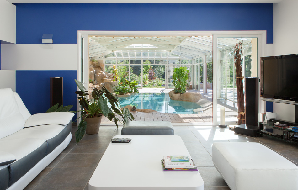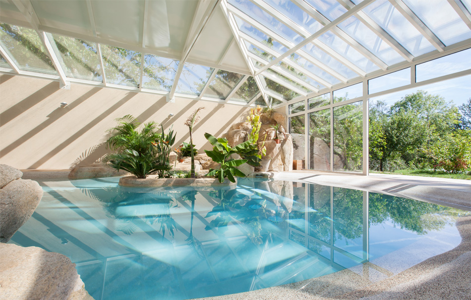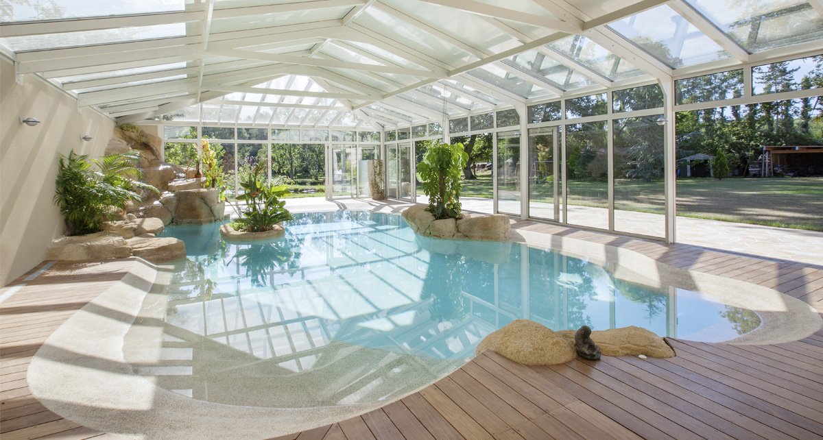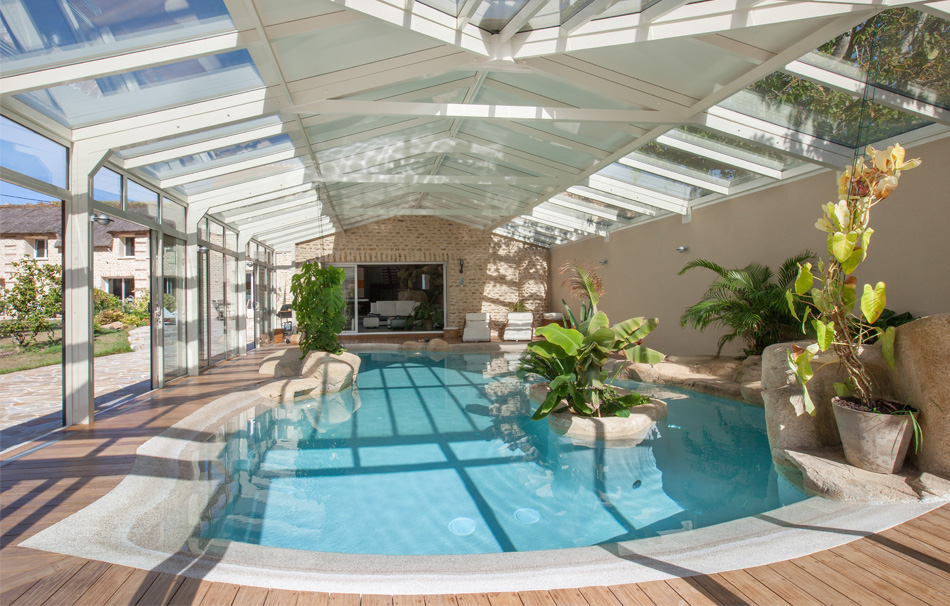 Un écrin de paradisLorsque des propriétaires en Bourgogne, avides d’exotisme, veulent prolonger les plaisirs de vacances, ils le font.. à domicile ! Comme un tableau dans le salon…Invitation aux rêves et aux voyages, la baie coulissante offre une perspective attractive sur cette oasis qu’est cette splendide réalisation de piscine sous véranda.Pour ce projet, le choix d’une piscine de forme libre s’imposait naturellement. Le pisciniste Diffazur et le concepteur des rochers artificiels ont réussi à sublimer cet ensemble en lui donnant des airs de lagune exotique.Une piscine exotique sous vérandaCet abri de piscine haut avec véranda est devenu un véritable écrin de paradis, inondé de clarté, qui permet de nager toute l’année.Le toit combine une partie périphérique en double vitrage et une partie centrale en panneaux sandwichs opaques et isolants pour profiter un maximum de la lumière naturelle tout en se protégeant l’été du soleil zénithal.Une harmonie parfaitePour rendre l’extension discrète et l’intégrer justement dans la propriété, la bicoloration des profilés a été retenue avec une teinte claire à l’intérieur et une teinte marron foncé à l’extérieur qui s’accorde aux tons des pierres naturelles des murs de la maison.Vous aussi, vous rêvez de prolonger les vacances à domicile ? Téléchargez notre catalogue de vérandas pour piscine.Vous souhaitez, vous aussi, profiter de bons moments en famille ou entre amis ? Demandez-nous un devis gratuit ! Contactez-nous pour nous confier vos projets etConcrétisez votre coup de cœur