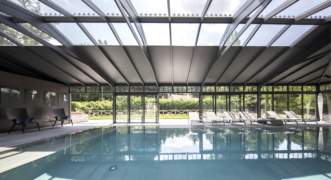 Une piscine couverte près de Paris : coup de cœur et choix raisonnéUne visite au Salon de la Piscine aura suffi : les clients que nous mettons à l’honneur aujourd’hui ont eu un coup de cœur pour les magnifiques réalisations du pisciniste Diffazur et ont su, dès cet instant, qu’ils seraient bientôt propriétaires d’une piscine privée. Mais comment réellement profiter de sa piscine toute l’année en région parisienne ? Un choix raisonné s’imposait : faire couvrir le bassin d’un abri de piscine haut sous véranda pour créer un espace accessible en toute saison. Un projet en collaboration avec DiffazurSur recommandation de Diffazur (merci à eux !), nos clients ont contacté notre société spécialisée dans la conception et l’installation de vérandas pour piscine. Dès la première rencontre, ils ont été convaincus de la qualité de nos produits et services, et ont partagé en toute confiance leur vision de leur futur espace piscine à Simon, responsable projet chez Cover Concept.Une véranda de style victorien en région parisienneInstallé en région parisienne, le couple rêvait d’une véranda pour piscine de style victorien, majestueuse et parfaitement intégrée dans le cadre naturel d’exception de leur propriété. Cependant, leur commune est soumise à des règles très strictes en termes de construction, imposées par les Bâtiments de France.Pour rencontrer le souhait de nos clients dans le respect des contraintes urbanistiques, nous avons étudié ce projet en collaboration avec un architecte spécialisé dans les normes de construction propres à cette région et développé des solutions à la fois esthétiques et conformes aux exigences du permis de bâtir.Pour ajouter du cachet à la réalisation, la véranda pour piscine est ornée de faîtières décoratives et les vitrages de l’imposte se parent de réglettes sobres et élégantes. La toiture mixte est constituée de panneaux sandwichs et d’un double vitrage feuilleté pour baigner l’espace d’une douce lumière.Un espace piscine à vivreL’espace piscine, bénéficiant d’une belle hauteur de construction, intègre un abri pool-house : ainsi, la pièce à vivre dispose de tout le confort propice à de belles baignades après le travail, quelle que soit la saison ou la météo.En outre, un bar qui traverse la véranda jusqu’à la terrasse extérieure offre de merveilleux moments de convivialité en famille et entre amis.Le coup de cœur de nos clients, grâce à quelques choix raisonnés, apporte une plus-value notable à leur propriété et un confort de vie indéniable. Chez Cover Concept, nous sommes conscients que les détails font la différence : confiez votre projet de couverture piscine à nos spécialistes de la véranda pour piscine pour un résultat à la hauteur de vos attentes ! Contactez-nous pour nous confier vos projets etConcrétisez votre coup de cœur