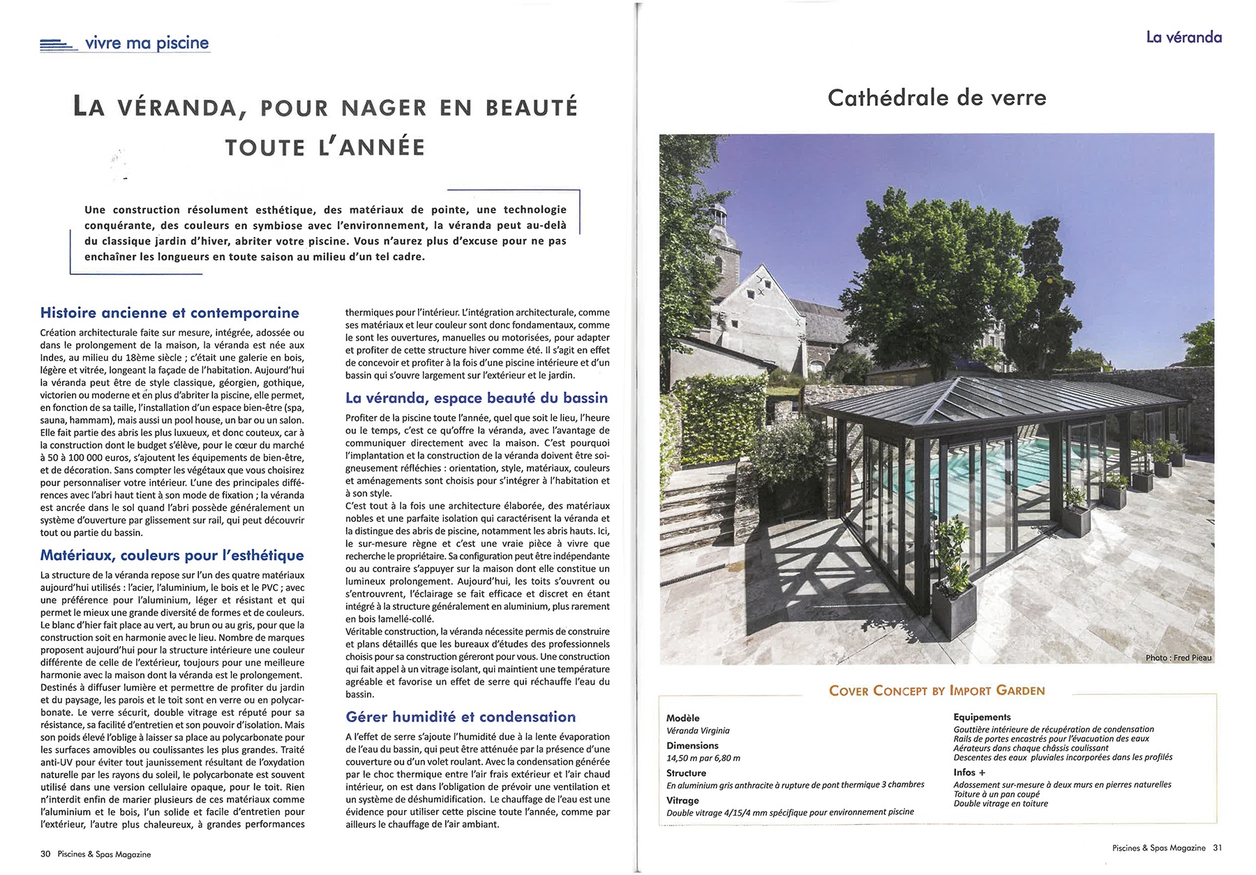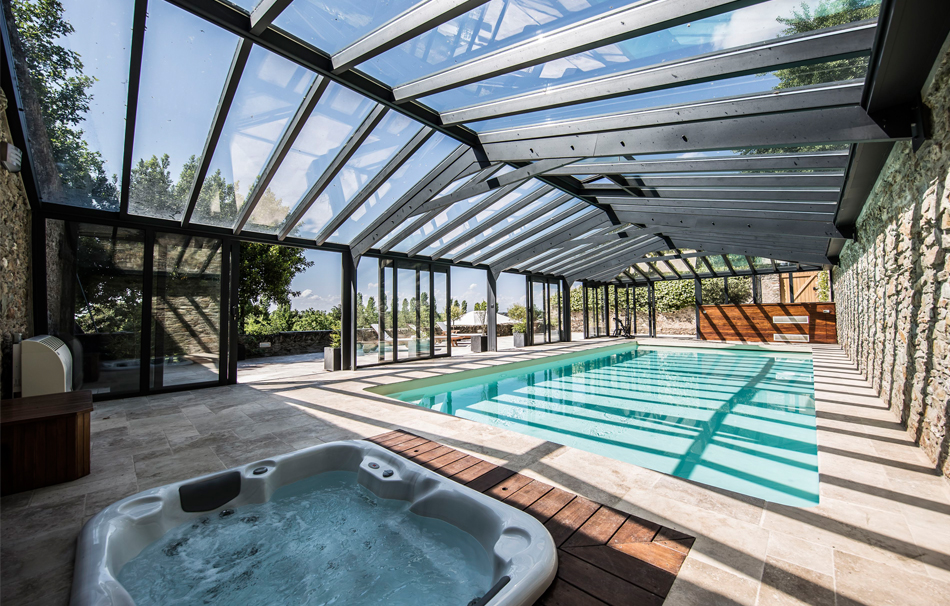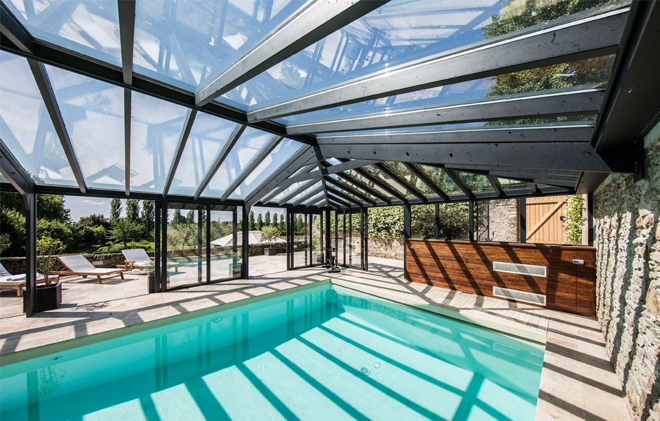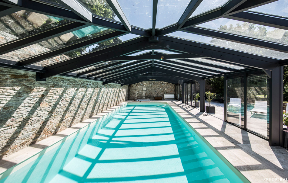 Une véranda de luxe pour piscine : un abri chic et sobre !Une véranda de luxe pour piscine dans l’enceinte d’un domaine datant de la fin du XVIIème siècle ? Voici un projet de construction qui exigeait distinction et sobriété : défi relevé en Anjou près d’Angers !Un permis de bâtir obtenu auprès du service d’architecture des Bâtiments de FranceLe domaine de notre client, situé en Anjou près d’Angers, a de quoi faire rêver : une superbe propriété de la fin du XVIIème siècle, entourée de bâtiments classés et conçue dans le style Mansart, précurseur de l’architecture classique française.Cependant, le rêve a un prix, celui d’exigences architecturales plus strictes dont l’objectif est de préserver et mettre en valeur ce patrimoine d’exception. Après trois demandes successives et cinq ans de démarches, l’architecte des Bâtiments de France a finalement accordé le permis de construire.Comment le permis de bâtir a-t-il été enfin obtenu ? Notamment grâce au projet de construction présenté par Cover Concept by Import Garden : en réponse aux critères d’éligibilité, il intégrait toutes les contraintes architecturales et techniques, parmi lesquelles l’obligation d’une toiture entièrement en verre…Une structure qui supporte plusieurs tonnes de double vitrageLes normes de construction imposées par le service des Bâtiments de France étaient à la hauteur de l’exceptionnel patrimoine historique représenté par cette propriété.Le défi architectural le plus difficile à relever fut l’intégration d’une toiture en double vitrage uniquement, excluant toute utilisation de matériau synthétique plus léger. L’abri haut pour piscine devait ainsi supporter plusieurs tonnes de verre, sans modifier ni le style classique ni le caractère historique du domaine.En outre, le terrain présentait des défauts de stabilité qui ont nécessité d’importants travaux de renforcement des fondations. Pour cette raison aussi, les murs ont en partie été reconstruits selon la méthode traditionnelle et à l’identique, en particulier le mur d’appui de la véranda. Une véranda de luxe pour piscine, chic et sobreAprès avoir pu apprécier le caractère esthétique de nos abris pour piscine sur notre site web et dans des revues spécialisées, Gilles, le propriétaire des lieux, a profité du Salon de la Piscine pour s’immerger dans une construction Cover Concept by Import Garden en taille réelle et en éprouver la haute qualité.Aujourd’hui, notre client se réjouit d’avoir fait appel à l’expertise de nos vérandalistes pour piscine. Plus qu’un spécialiste de la véranda, il cherchait un prestataire capable à la fois de concrétiser son projet de piscine intérieure accessible quotidiennement et de respecter le style architectural remarquable de sa propriété.Notre travail d’artisan a convaincu Gilles de la possibilité d’intégrer une construction neuve et moderne dans un environnement de caractère.Son vœu d’une véranda de luxe pour piscine, sobre et fonctionnelle, est exaucé. Sa piscine installée par Rêva Piscine, agrémentée d’un volet motorisé et d’un jacuzzi, est accessible quand il le souhaite lors de chaque séjour au domaine familial. Ici règnent le chic et la sobriété… à découvrir également dans notre catalogue ! Quand la presse parle de notre réalisation… Bonne nouvelle ! Le magazine « Piscines & Spas » met à l’honneur notre cathédrale de verre dans son dernier numéro paru en décembre 2019. L’occasion de revenir sur les origines de la véranda pour piscine et sur ses nombreux avantages. Le visuel sublime la mise en page de l’article et invite à l’évasion…Merci à « Piscines & Spas » pour cette belle visibilité ! CARACTÉRISTIQUES TECHNIQUES :Véranda « Virginia » 6,80 x 14,50 mCouleur thermolaquage : gris anthraciteVéranda en aluminium à rupture de pont thermique 3 chambresDouble vitrage 4/15/4mm spécifique pour environnement piscineGouttière intérieure de récupération de condensationRails de portes encastrés pour l’évacuation des eaux stagnantesAérateurs dans chaque châssis coulissantFermeture de l’abri de piscine à clefDescentes d’eau pluviale incorporées dans les profilésOPTIONS :double vitrage en toituretoiture à un pan coupétabatière de ventilation en toitureVous souhaitez, vous aussi, profiter de bons moments en famille ou entre amis ? Demandez-nous un devis gratuit ! Contactez-nous pour nous confier vos projets etConcrétisez votre coup de cœur