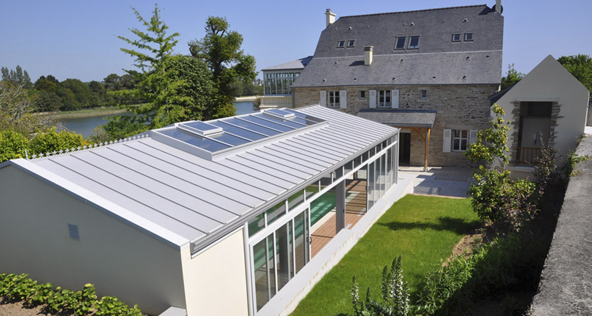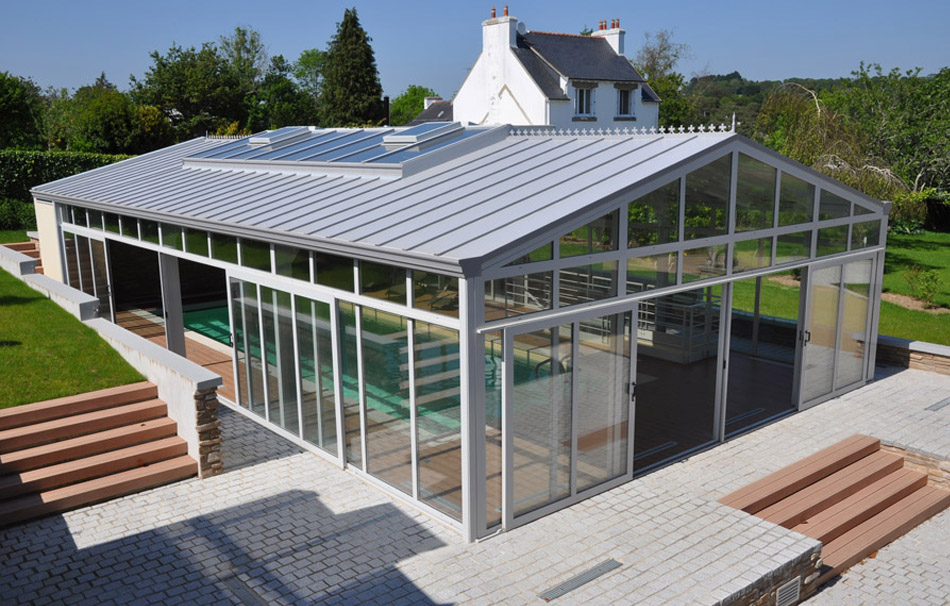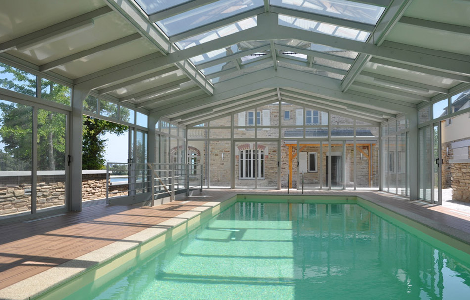 Harmonie architecturaleCette réalisation de véranda pour piscine a relevé avec brio le défi des contraintes des bâtiments de France et des souhaits des occupants de cette magnifique propriété bretonne.Le projet : intégrer, à la rénovation complète de la propriété, une piscine utilisable toute l’année. Le défi : trouver l’abri de piscine qui répond à ces contraintes et aux exigences urbanistiques des bâtiments de France auxquelles ce magnifique site breton est tenu. C’est la véranda pour piscine Virginia Cover Concept qui a été retenue à la fois pour ses qualités isolantes qui permettent de nager toute l’année. D’autre part la nature de sa structure a permis la réalisation de la toiture en panneaux sandwichs isolants et l’integration d’une verrière en double vitrage équipée de fenêtres de toit motorisées.Mais les qualités fonctionnelles et techniques ne suffisent pas pour un tel projet. C’est avec le concours de l’architecte parisien M. Cedrin que ce projet a été accepté par les services des bâtiments de France. En effet, malgré la taille imposante de l’ensemble il a fallu la rendre discrète en l’enterrant en partie sous le niveau naturel du jardin. Le toit en aluminium, lui, a dû donner l’illusion d’être en zinc pour rappeler le véranda de la maison. L’entraxe des profilés de toiture a ainsi été réduit de moitié et la couleur, similaire à celle du zinc, est différente de celle des chassîs des parois verticales.Enfin, pour parfaire la fonctionnalité de ce nouvel espace loisir, un passage souterrain le relie à la maison offrant en toute saison un accès à la piscine à 28° constant.Vous souhaitez, vous aussi, profiter de bons moments en famille ou entre amis ? Demandez-nous un devis gratuit ! Contactez-nous pour nous confier vos projets etConcrétisez votre coup de cœur