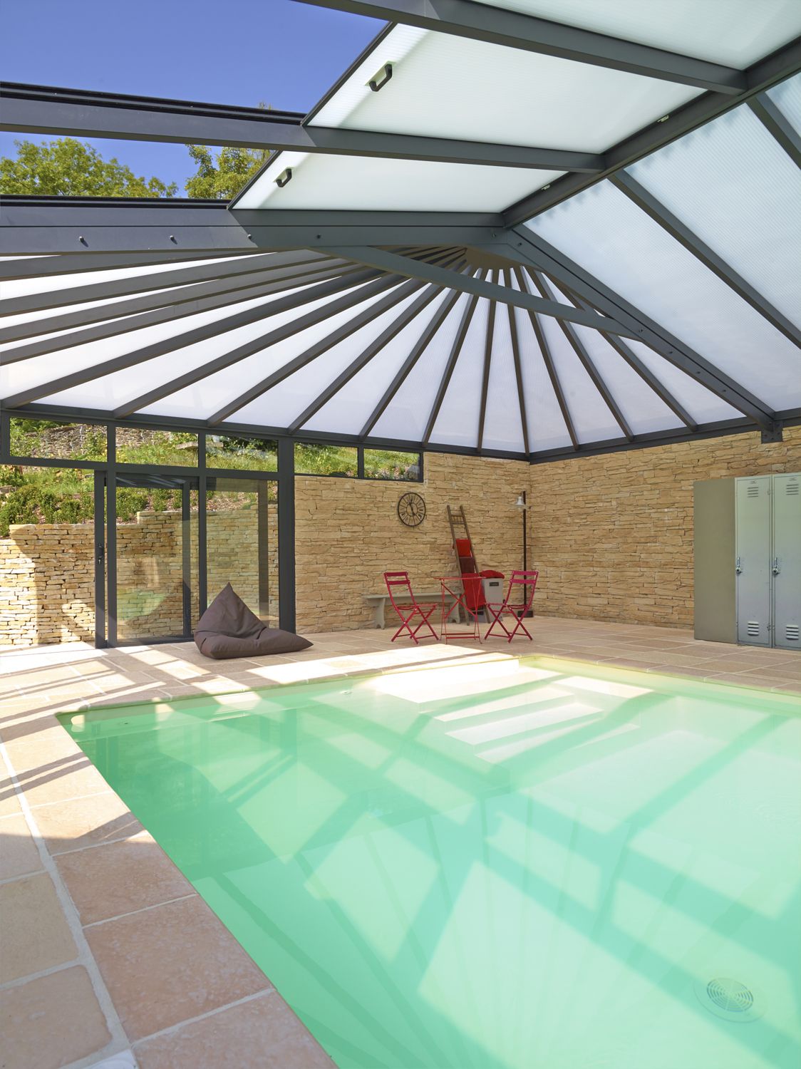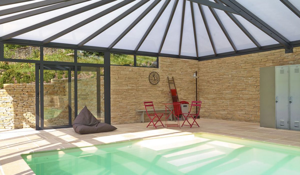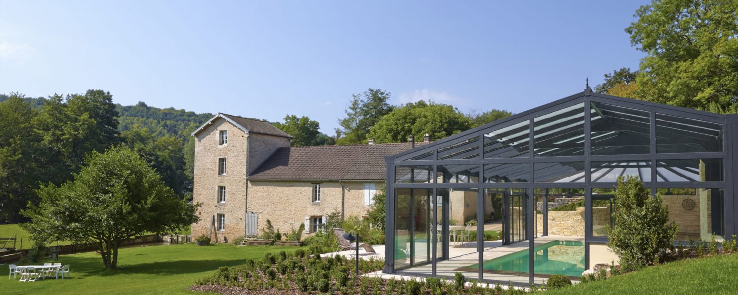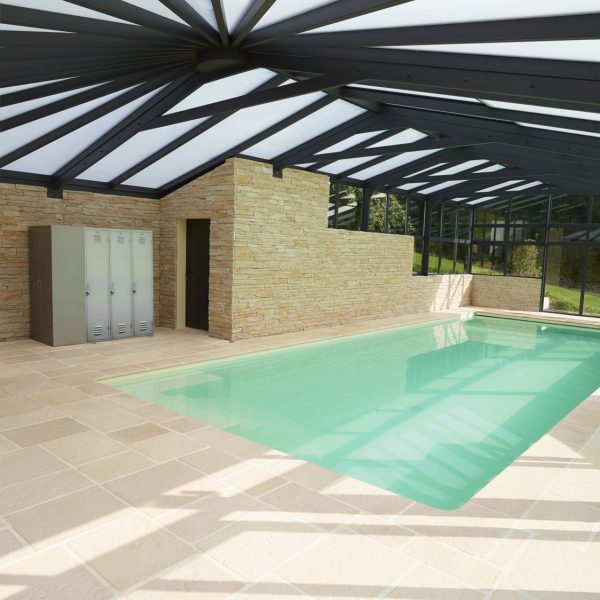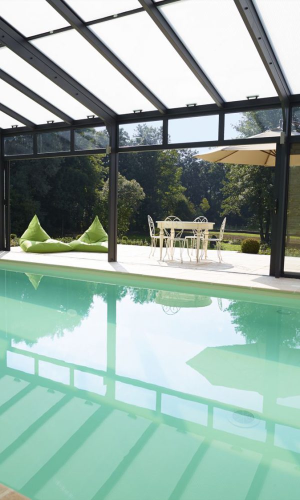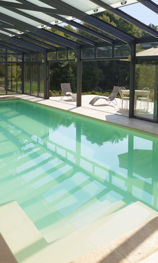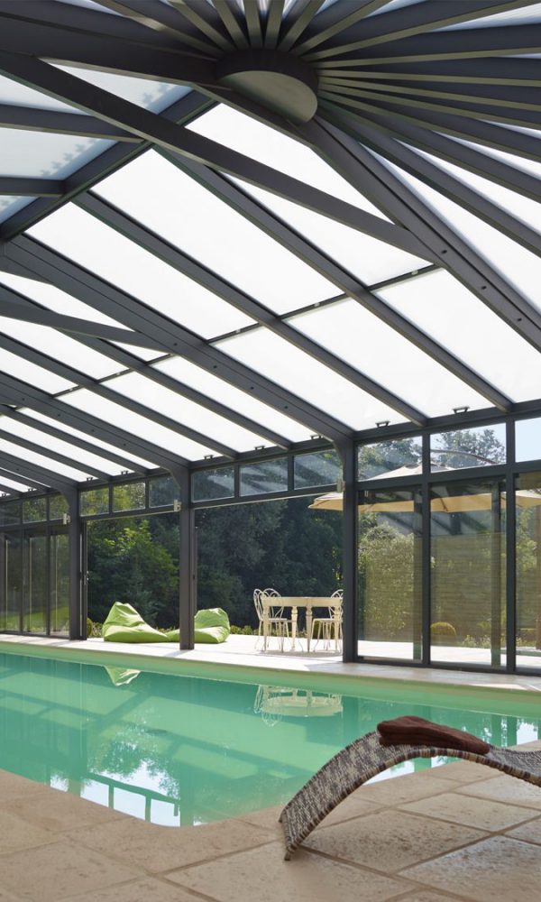 PISCINE INTÉRIEURE SOUS VÉRANDA en Côte d’OrUne réalisation qui vaut de l’or Une véranda pour piscine dans un espace de verdure… C’est ce que propose Cover Concept avec ce magnifique lieu de détente. La piscine est baignée de lumière grâce aux parois vitrées et à la toiture en polycarbonate. Contactez-nous pour une étude gratuite de vos projets Nous vous conseillons en fonction de vos besoins.