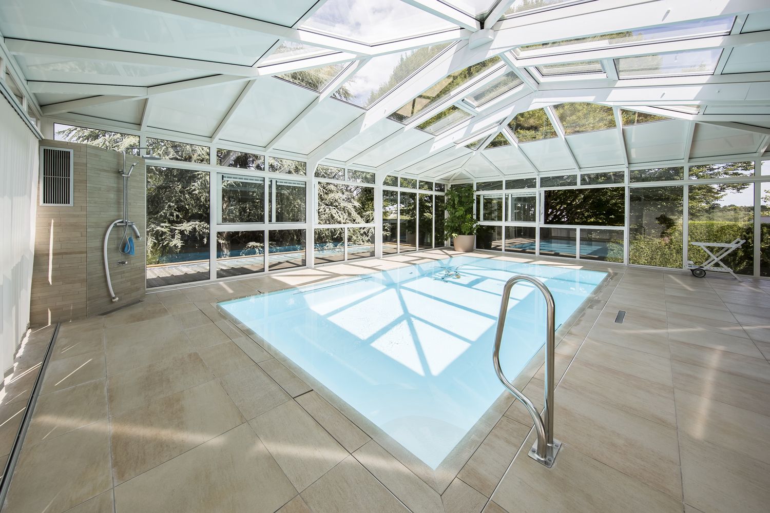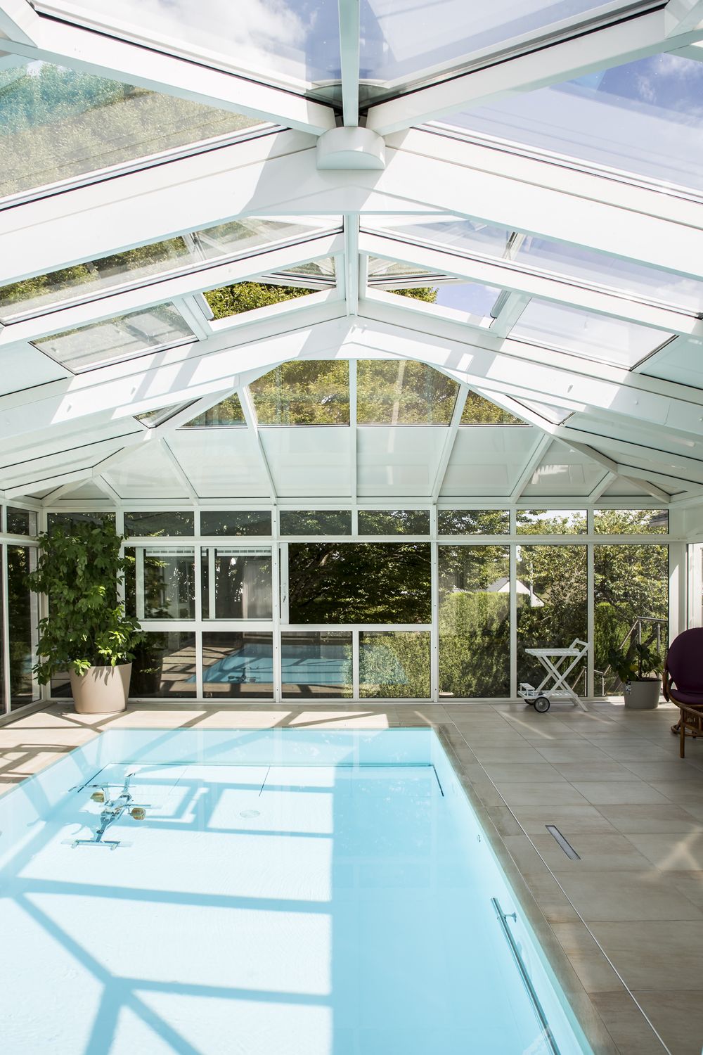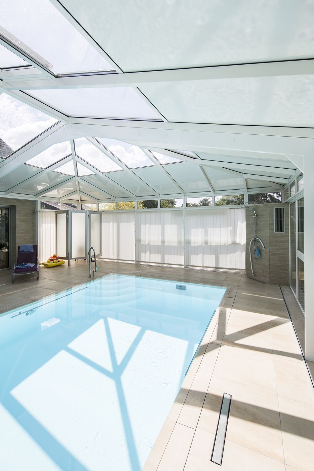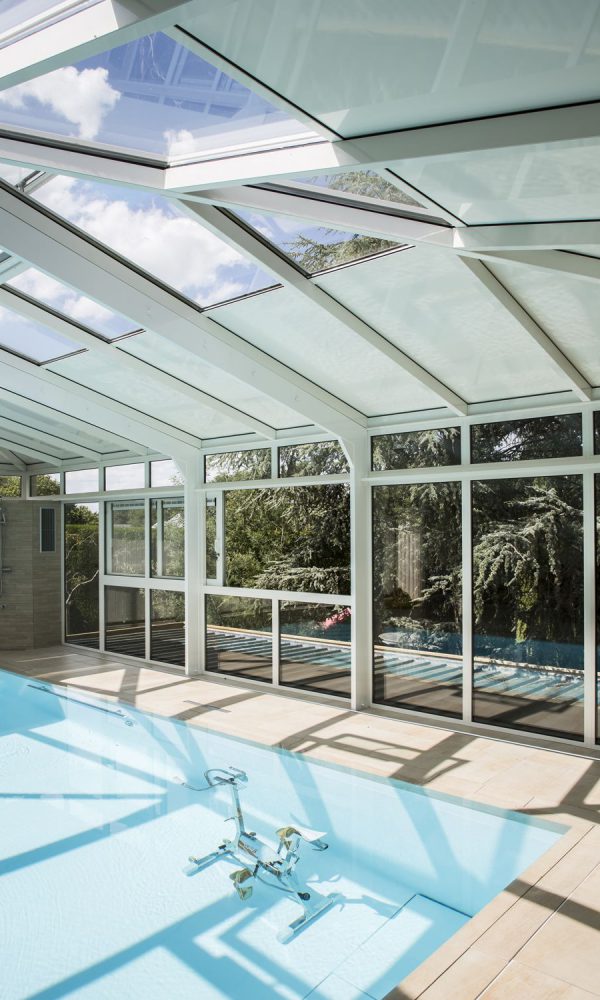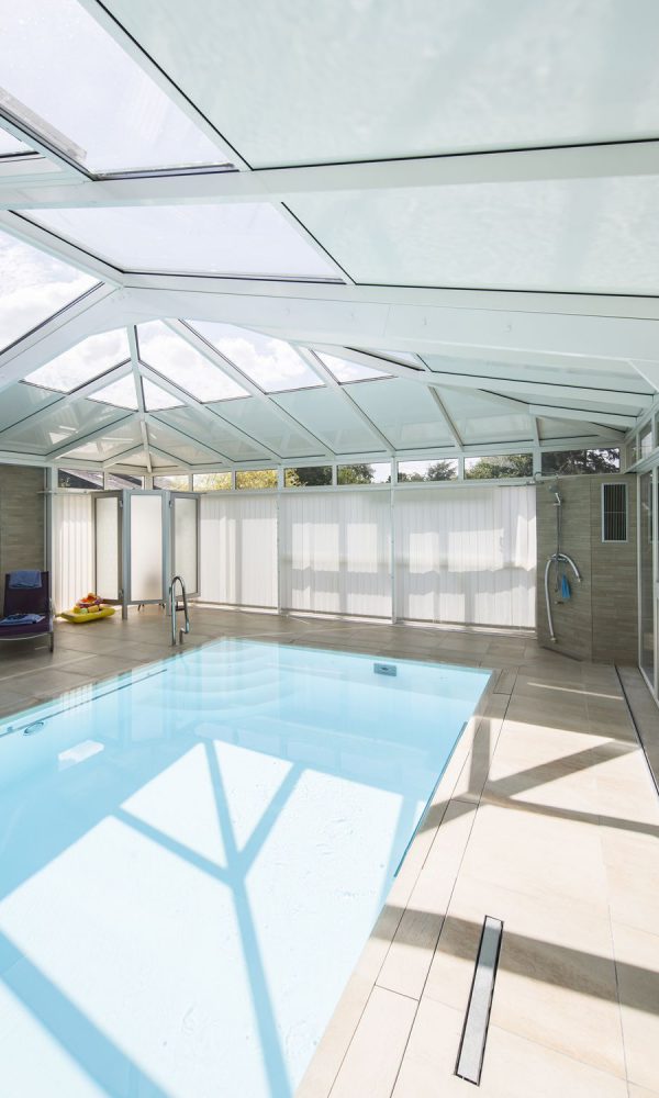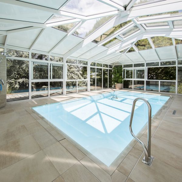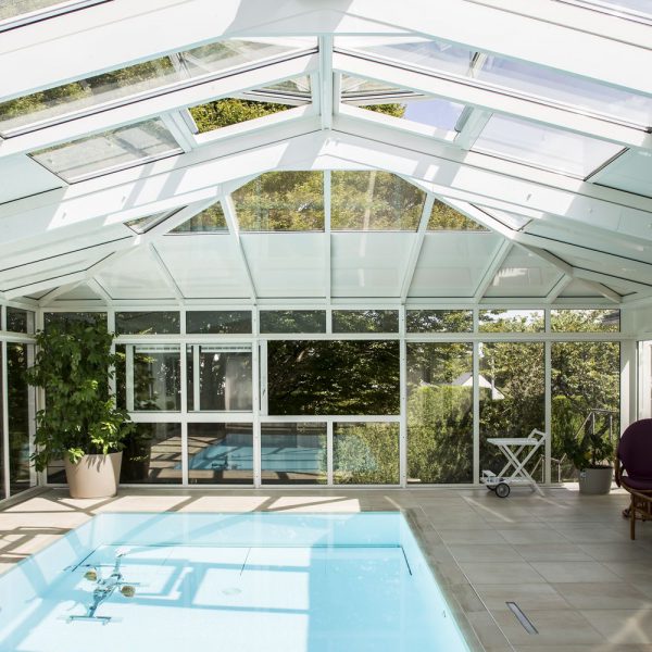 La toiture en aluminium de cette véranda pour piscine donne du cachet et de la luminosité naturelle à cet oasis de tranquillité. Nos images ne vous donnent-elles pas envie d’y faire un petit plongeon ?