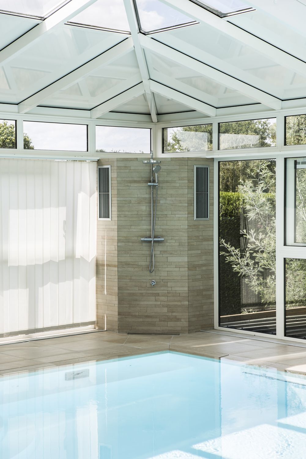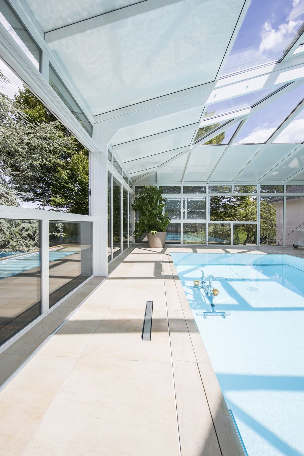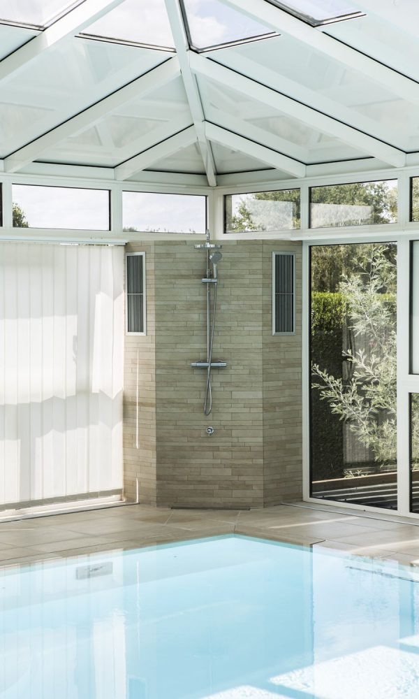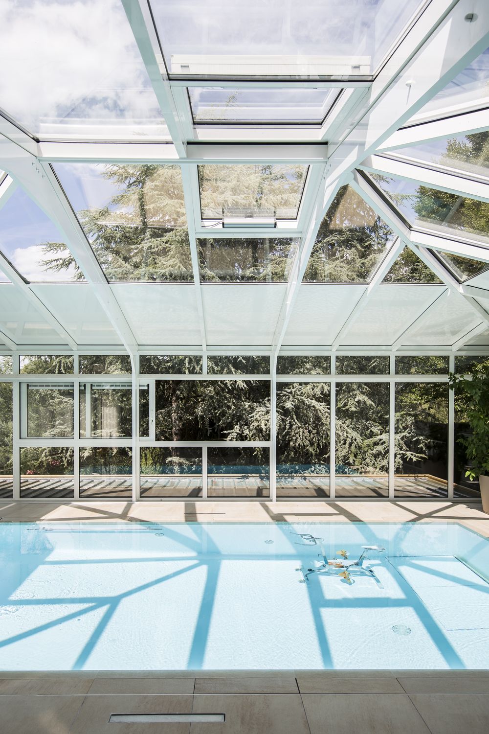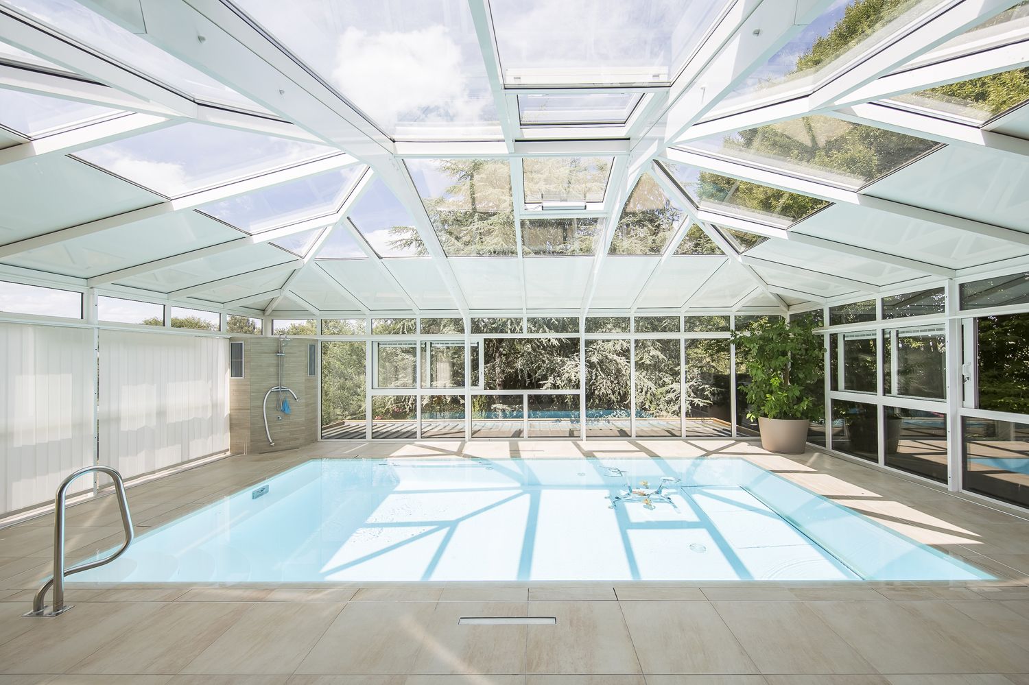La toiture en aluminium de cette véranda pour piscine donne du cachet et de la luminosité naturelle à cet oasis de tranquillité. Nos images ne vous donnent-elles pas envie d’y faire un petit plongeon ?