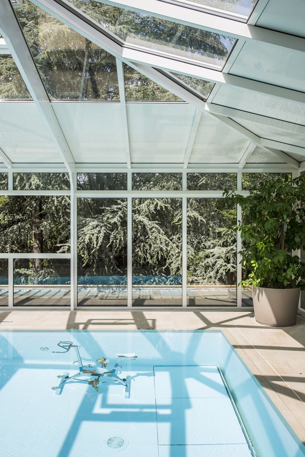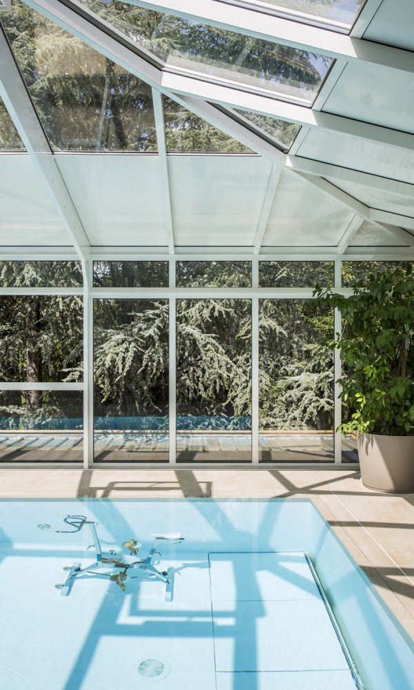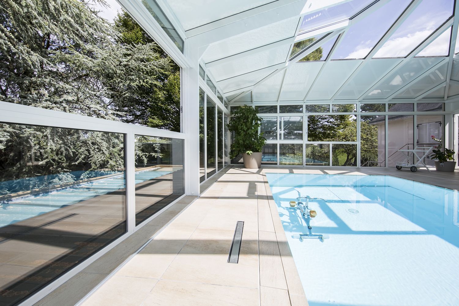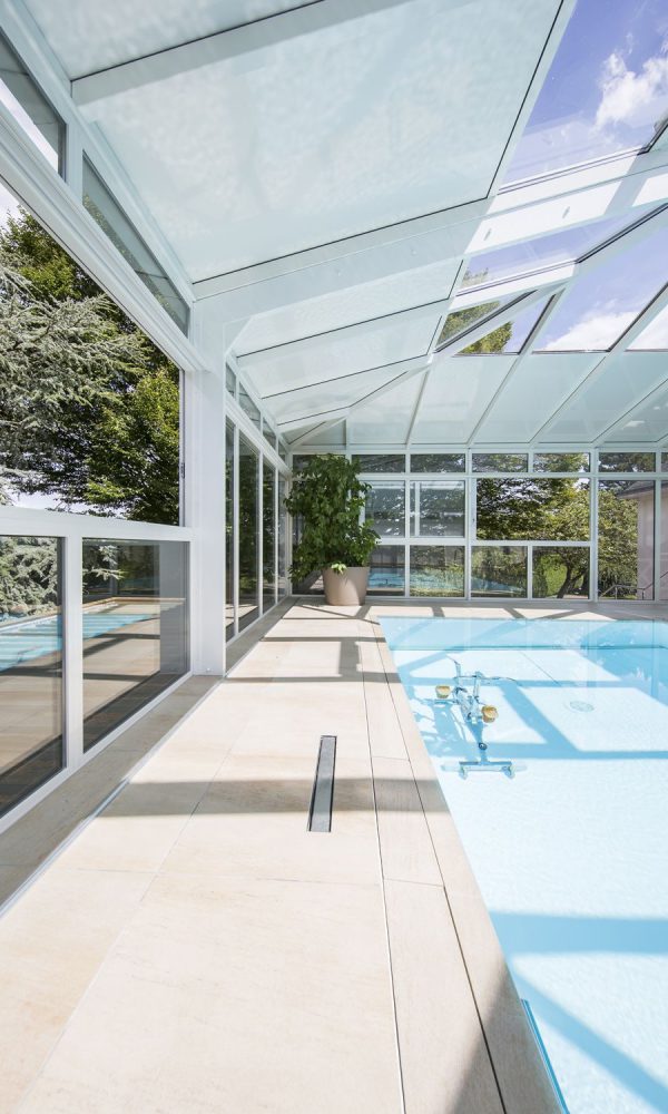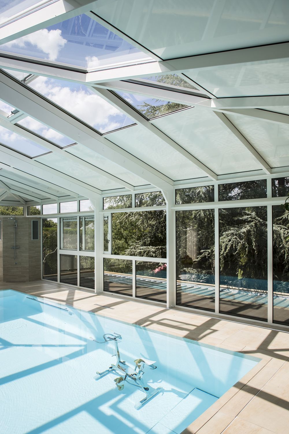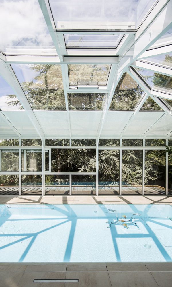 La toiture en aluminium de cette véranda pour piscine donne du cachet et de la luminosité naturelle à cet oasis de tranquillité. Nos images ne vous donnent-elles pas envie d’y faire un petit plongeon ?