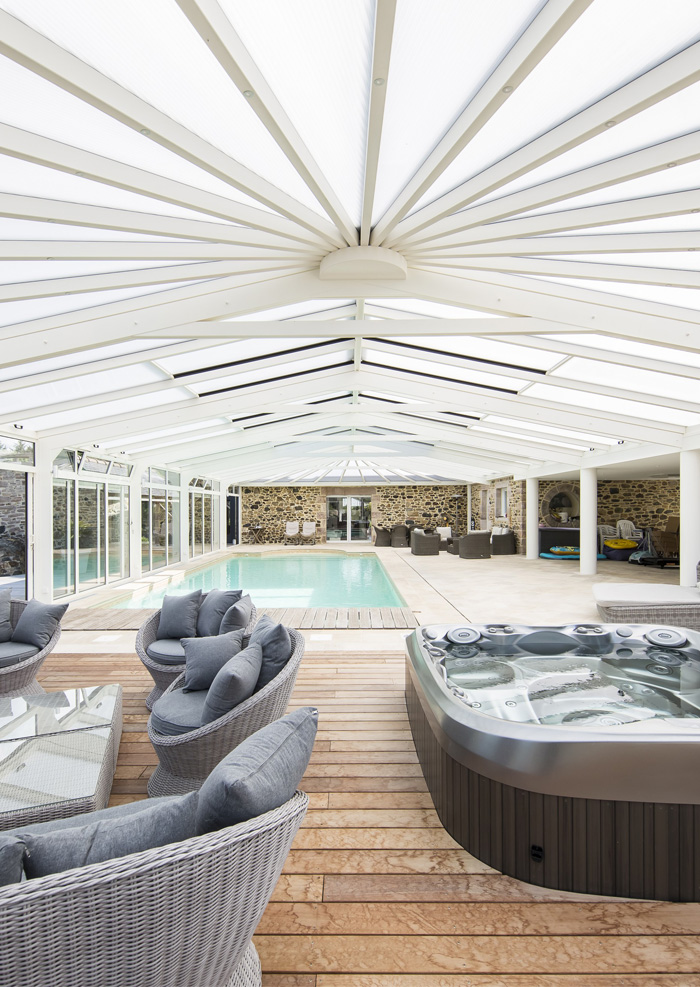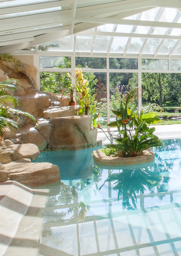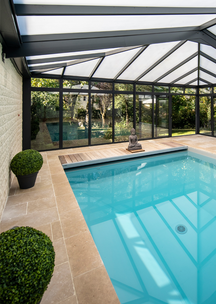 Design de piscine intérieure sous vérandaVous souhaitez séparer votre espace de baignade de vos pièces à vivre sans perdre les avantages liés à une extension d’habitation ? Cover Concept by Import Garden propose des solutions design pour intégrer harmonieusement votre piscine intérieure.Baies vitrées coulissantes : cloisonner votre espace de baignadeCréez une bulle de confort design et intimiste grâce à nos solutions d’intégration. Nous vous proposons des baies vitrées coulissantes afin de scinder votre véranda pour piscine et vos autres pièces de vie. Envie de plonger tête la première dans votre bassin juste après avoir lu un bon roman sur votre divan ou dégusté un délicieux café dans votre salle à manger ? Nos baies vitrées coulissantes offrent une ouverture simple, rapide et lumineuse. Vos avantages : les odeurs de chlore ne viennent pas titiller vos narines lors de vos activités quotidiennes et vous contrôlez entièrement l’accès à votre piscine. Nos cloisons sont effectivement pourvues d’une serrure à clé. Si vous avez des enfants en bas âge, c’est une solution de sécurité non négligeable pour vivre votre espace de loisirs et de détente sans stress ! Les déperditions thermiques sont également stoppées par les excellentes valeurs d’isolation de nos coulissants. Un confort absolu, également souligné par un apport de lumière bienvenu et un gain d’espace. Elégantes et pratiques, nos baies vitrées coulissantes à profilé en aluminium s’intègrent à votre environnement et sont réalisées sur-mesure. Dimensions, poignées, teintes et couleurs… Réalisez votre espace de baignade en fonction de vos goûts, mais aussi de vos besoins et des contraintes architecturales. Volume et perspectiveIl est temps d’agrandir les volumes et de changer les perspectives ! Bien plus qu’un espace supplémentaire, la véranda en extension d’habitation est une véritable pièce de vie à part entière. Eclairage LED, aménagement d’un jacuzzi, design moderne ou traditionnel… Ouvrez les portes de votre imagination et créez un espace intérieur qui vous ressemble. Le maître-mot pour une architecture réussie ? L’harmonie. Il est, en effet, primordial de choisir un style et une ambiance en concordance avec ceux de votre maison pour prolonger son essence même. Structurez les espaces avec des solutions d’aménagement fonctionnelles et esthétiques pour vous sentir bien chez-vous. Passez du rêve à la réalité et valorisez votre bien grâce aux vérandas Cover Concept ! Intéressé(e) par nos vérandas à toit ouvrant ?Demandez votre devis gratuit
